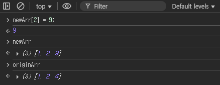 이제 동일하게 2번 인덱스 값만 9로 바꾼 뒤 newArr와 originArr를 비교해보자.