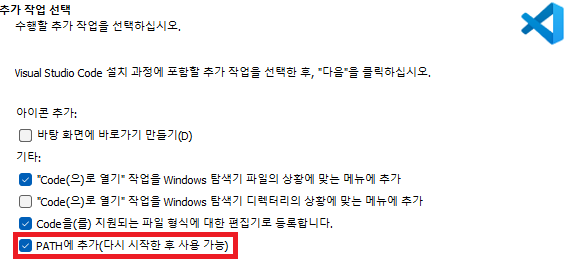 PATH에 추가(다시 시작한 수 사용 가능) 을 추가해주자!