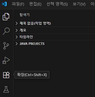 Extention (확장) 은 VS Code 실행 후 왼쪽 5번째 아이콘을 클릭하거나