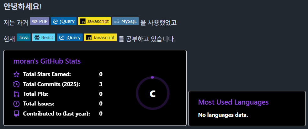 해당 이미지는 gitHub-readme-stats의 api를 통해 링크로 이미지를 가져와 마크다운으로 표기해주는 방식입니다.