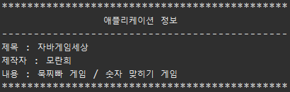 숫자를 입력해 사용자가 실행할 메뉴를 고를 수 있게 하고 해당 메뉴의 내용을 실행.- 애플리케이션 정보 : 애플리케이션 내용을 출력 후 메뉴로 복귀