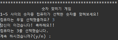 - 숫자 맞히기 게임 : 1~5 사이 렌덤한 숫자를 입력후 맞췄는지 판단