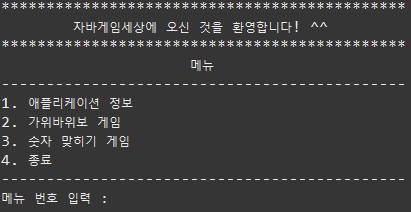 숫자를 입력해 사용자가 실행할 메뉴를 고를 수 있게 하고 해당 메뉴의 내용을 실행.- 애플리케이션 정보 : 애플리케이션 내용을 출력 후 메뉴로 복귀