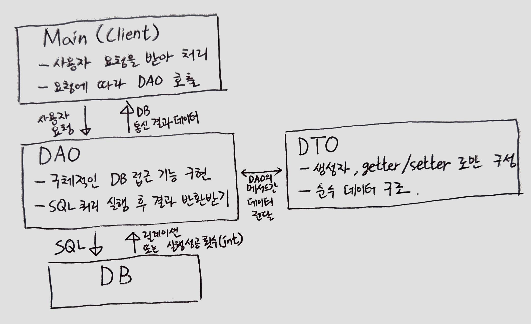 [현대이지웰 Java 풀스택 개발자 아카데미 6월] TIL 7주차 - JDBC를 이용한 JAVA의 데이터베이스 접근과 DTO, DAO를 도입하기 위한 구조도