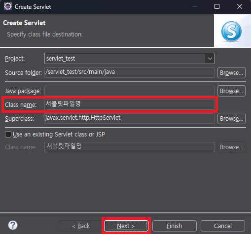 그 후 서블릿 파일 이름을 입력해주고