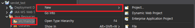 Java Resources 의 src/main/java에 오른클릭 > New > Servlet을 선택해 줍니다.