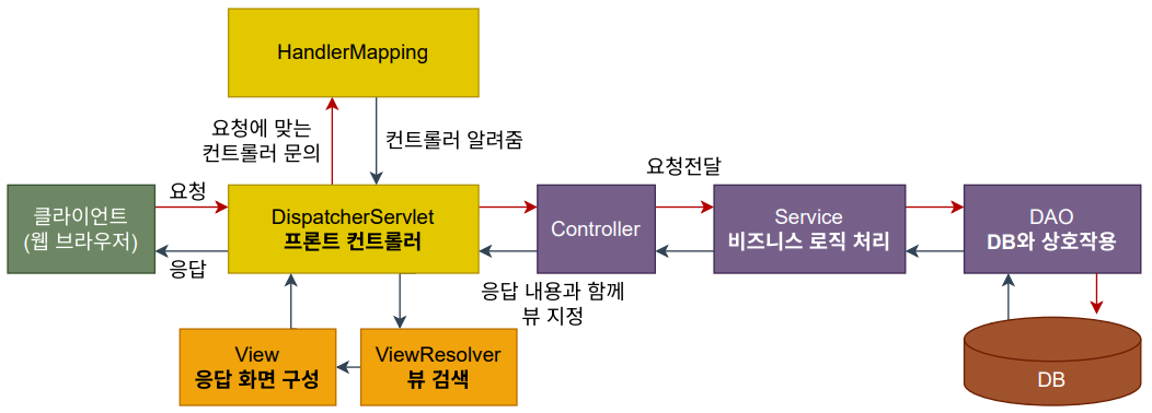 위 다이어그램은 프론트 컨트롤러 MVC 방식을 도식한 것입니다.