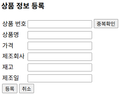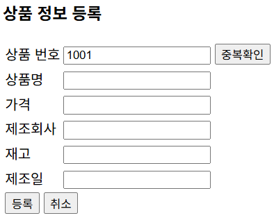 [중복확인] 버튼을 누르면 입력한 상품 번호를 DB에 조회한 후