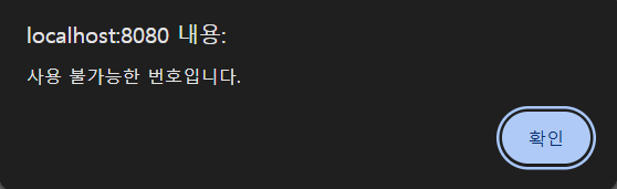 ajax의 성공 함수에 설정한 내용대로 사용 불가능한 번호입니다. 라는 알람창을 띄우게 됩니다!