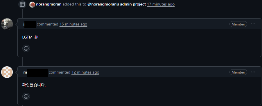 그러면 이런 식으로 팀원들이 코드를 확인했다는 표시를 달아줍니다.