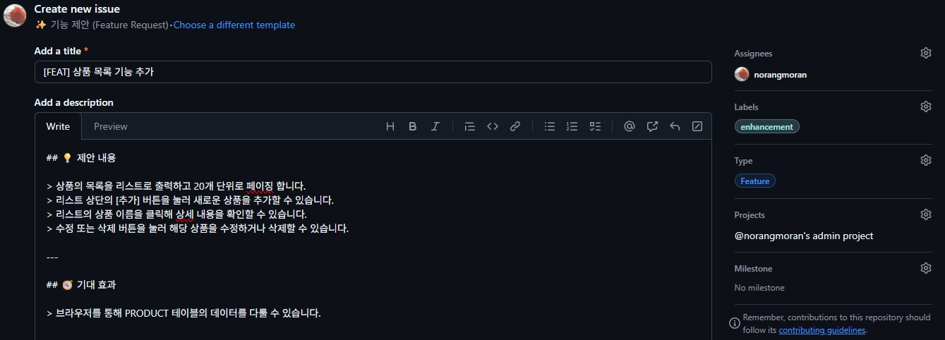 Assignees는 담당자를 설정할 수 있는데, 클릭 후 제 아이디인 norangmoran을 설정했습니다.
