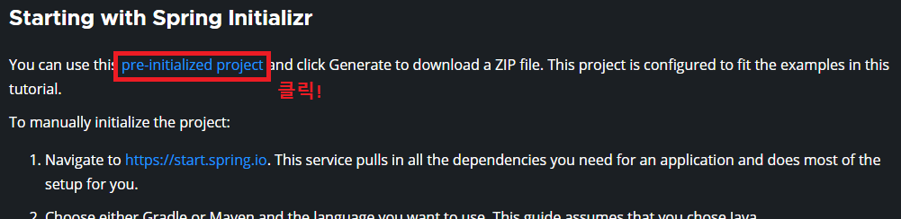 그중 Starting with Spring Initializr 항목을 확인하면 필요한 의존성을 선택해둔