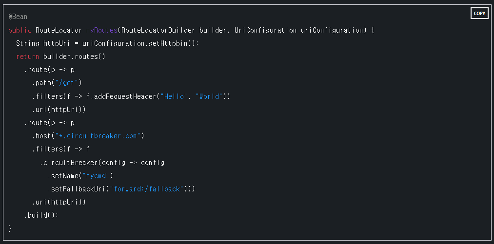 GatewayApplication 클래스 내부 가장 하단에 공식문서에서 추가하라는 빈을 복사해 붙여넣습니다.