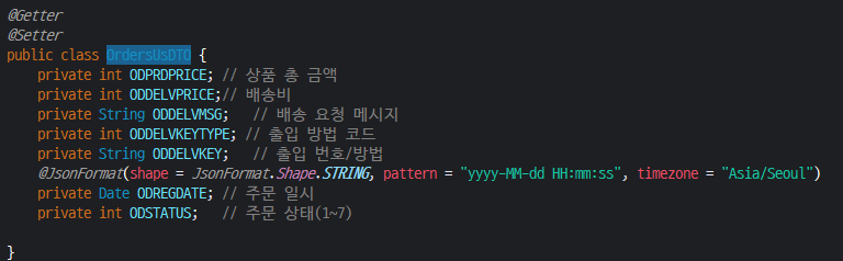DTO를 보면 ODREGDATE에만 @JsonFormat 어노테이션이 붙어있는데